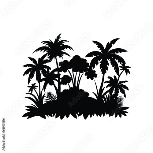 Obraz premium Silhouette of tropical plants and trees in black color over white, jungle bush silhouette vector illustration