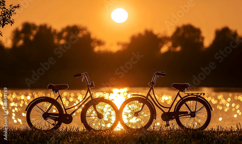 Obraz premium Silhouette of Two Bicycles at Sunset by a Lake