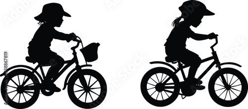 © Amna, Obraz premium Silhouette of two children joyfully riding bicycles, vector illustration
