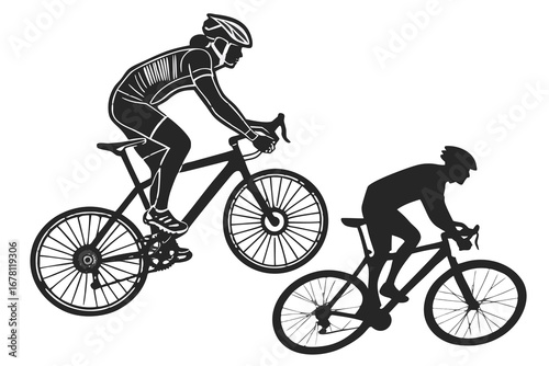 © sikandar creation, Naklejka premium silhouette of Two cyclists riding bicycle in monochrome isolated on transparent background