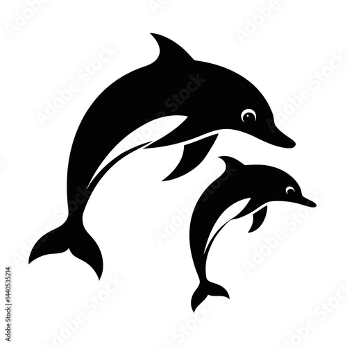 Obraz premium Silhouette of two dolphins swimming in a circular pattern, black and white...