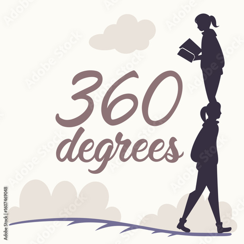 Fototapeta premium Silhouette of two girls stacked with 360 degrees text and clouds on a light background visual image