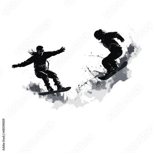 © Unreal image, Fototapeta premium Silhouette of two guys performing snowboarding tricks on the snow