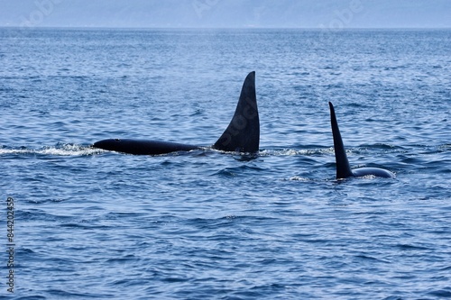 Fototapeta premium silhouette of two male Orcas, Shiretoko in Hokkaido, Japan