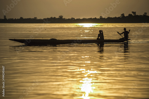 © Louise, Naklejka premium Silhouette of two people in boat at sunset in Central African Republic