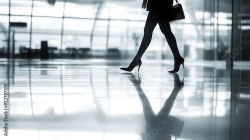 Fototapeta premium Silhouette of Woman in Heels Walking on Shiny Floor in an Airport