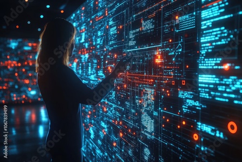 Fototapeta premium Silhouette of woman interacting with glowing screen. Great for technology, data, and AI concepts.