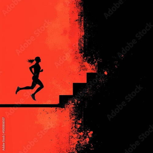 © Ai DreamscapesTH, Naklejka premium Silhouette of Woman Running Up Stairs with Abstract Red and Black Background
