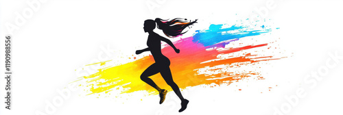 © Punn, Naklejka premium Silhouette of woman running with colorful paint splashes in background, symbolizing energy and movement. vibrant colors add dynamic and artistic touch to scene