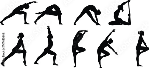 © Sakib World, Fototapeta premium Silhouette of women practicing yoga poses, fitness workout illustration, stretching exercise, healthy lifestyle, meditation, body balance, flexibility vector design