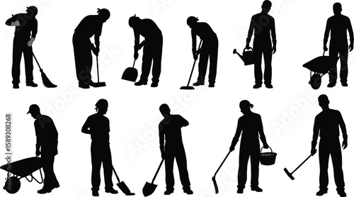 Obraz premium Silhouette of workers performing various gardening, cleaning, and maintenance tasks, outdoor laborers, people working with tools, vector illustration, isolated