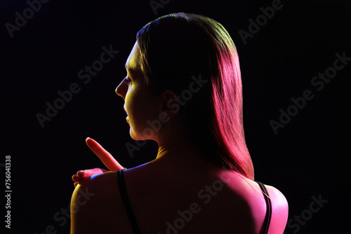 © Pixel-Shot, Obraz premium Silhouette of young woman on dark background, back view