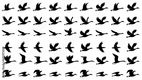 © Shoaib, Naklejka premium Silhouette pattern of geese in flight showing various wing positions against a white background in rows and columns