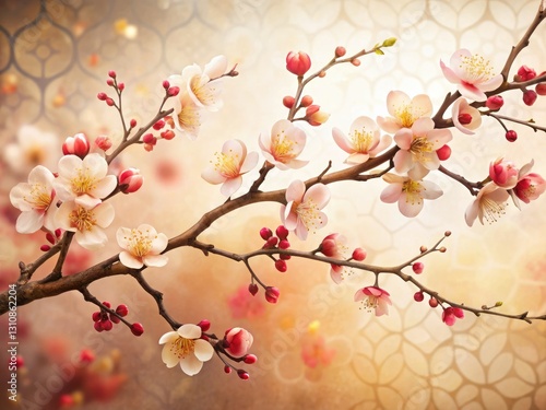 © dokrak, Fototapeta premium Silhouette Plum Blossoms: Ivory Coral Geometric Handpainted Art