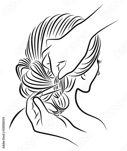 © Nataliia, Naklejka premium Silhouette profile of the head of a lovely lady. The girl braids her long hair in braids with her hands. Vector illustration.