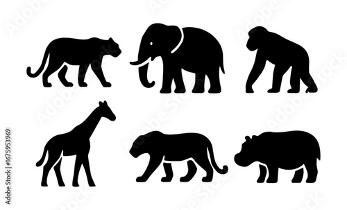 Obraz premium Silhouette safari animals: elephant, gorilla, giraffe, hippo, and big cats in black