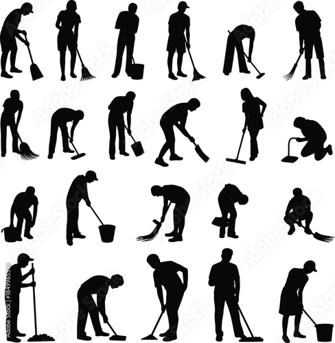 © Samiul, Obraz premium Silhouette set of people performing various cleaning tasks, including sweeping, mopping, and using cleaning tools for home or office maintenance and hygiene