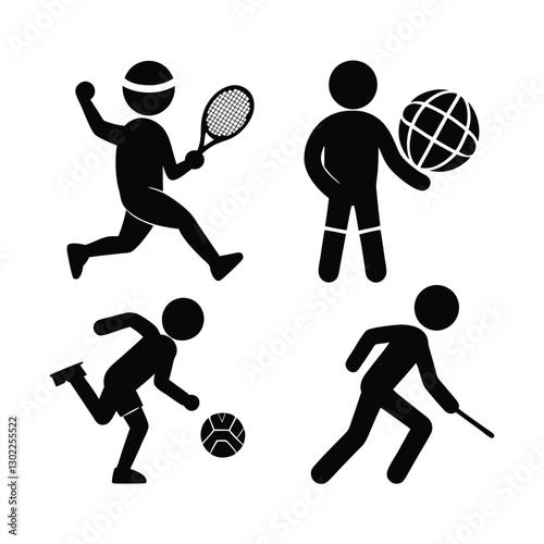 Fototapeta premium Silhouette set of sports icons including tennis player, ball, racket, and action illustrations in vector style