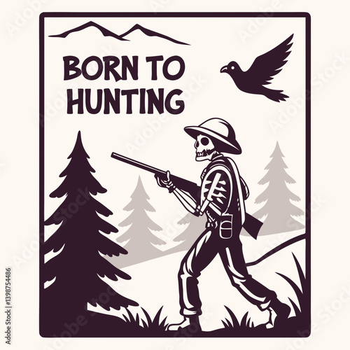 Fototapeta premium Silhouette Skeleton Hunter With Gun In Forest Born To Hunting Text