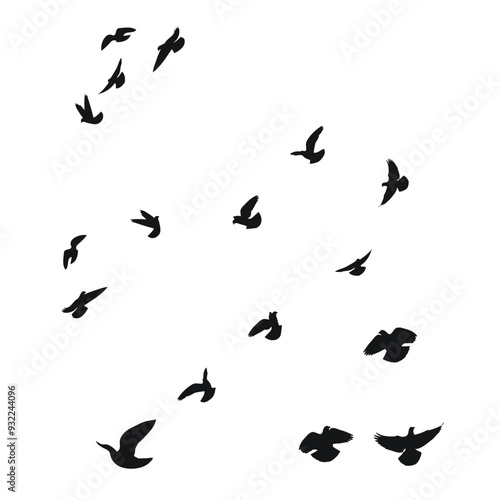 © Mar, Fototapeta premium Silhouette sketch of a flock of flying birds, flight in different positions. Takeoff, flying, flight, flutter, hover, soaring, landing