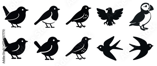 © supplement, Naklejka premium Silhouette solid icons of various birds. Set of black icon isolated PNG