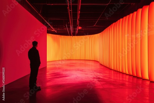 © talkative.studio, Fototapeta premium Silhouette stands in a space filled with orange light. Vertical stripes glow warmly against wall