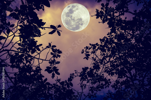 Naklejka premium Silhouette the branches of trees against the night sky in a full moon