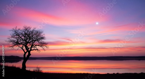 © Rainy, Fototapeta premium Silhouette Tree at Colorful Sunset Sky Over Lake Water Reflection