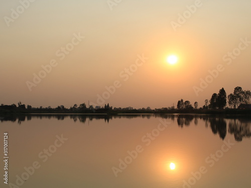 © chainaphon, Fototapeta premium silhouette tree in asia with sunset.Tree silhouetted against a setting sun.Dark tree on open field dramatic sunrise and reflection in water.
