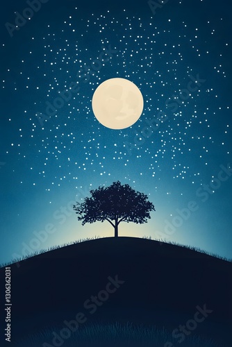 Naklejka premium Silhouette tree moonlit hill at night