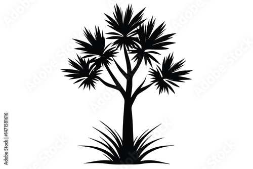 © kanchanrani, Fototapeta premium Silhouette tree shows spiky leaves and lush grass, creating a stark contrast