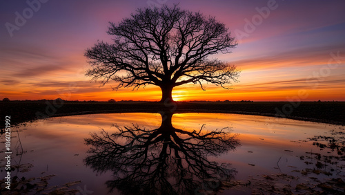 © Tania, Fototapeta premium Silhouette Tree with Reflection on Water at Dramatic Sunset Sky