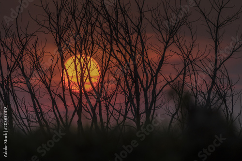 © aedkafl, Obraz premium silhouette trees on mountain in spooky sunset sky atmosphere.