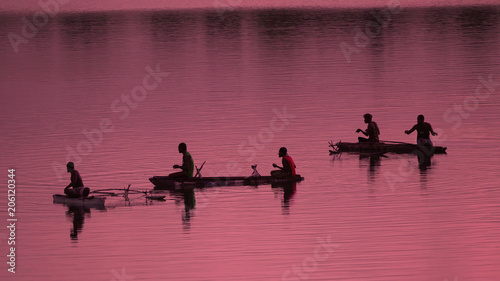 Naklejka premium SILHOUETTE Unrecognizable local fishermen fishing in small boats at pink sunrise