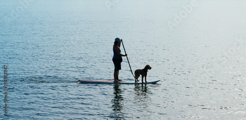 Naklejka premium Silhouette unrecognizable woman and dog on stand-up paddle-board paddling...