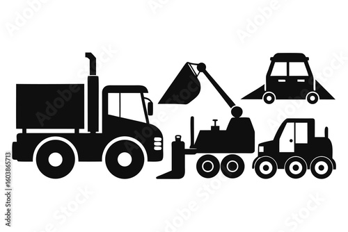 Fototapeta premium Silhouette Vector Illustration of Construction Vehicles Including a Truck Excavator and Road Roller Perfect for Infographics and Educational Materials