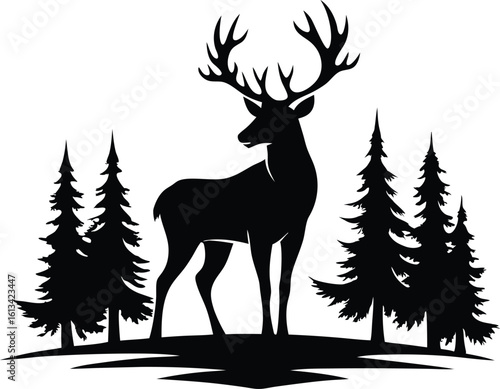 Obraz premium Silhouette vector of a deer with pine trees and forest scenery, deer with...