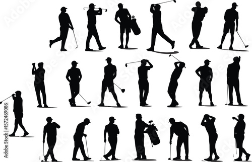 Obraz premium Silhouette vector of male golfers playing, swinging, standing, putting, carrying golf bag, professional golf illustration, flat isolated design art