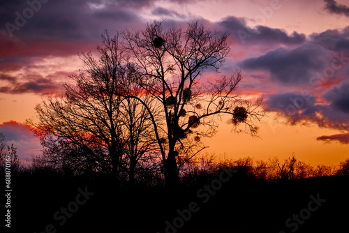 Obraz premium Silhouette von einem Baum mit Misteln im bunten Licht des Sonnenuntergangs