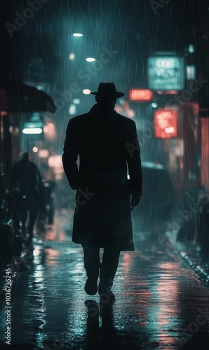 © jambulart, Obraz premium Silhouette walking in rain at night.
