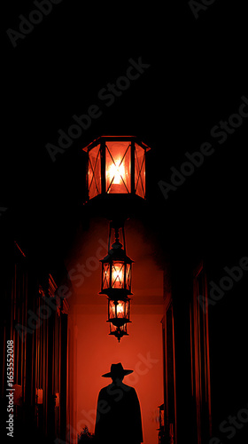 © Taufiq, Fototapeta premium Silhouette Walking Under Glowing Lanterns in Dim Corridor During Mid-Autumn Festival Celebration
