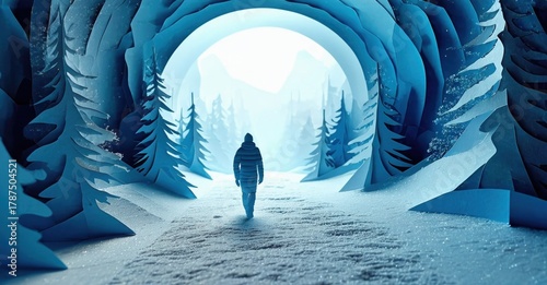 Fototapeta premium Silhouette walks toward bright light within paper forest. Winter scene evokes calm, serene atmosphere. Blue tones dominate composition.