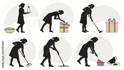 Obraz premium Silhouette woman cleaning various household chores sweeping mopping vacuuming daily routine home domestic work set