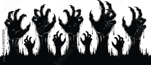 Fototapeta premium Silhouette zombie hands rising from ground with dripping texture representing...