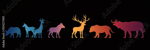 Obraz premium Silhouetted animals in gradient hues on black background for educational and...