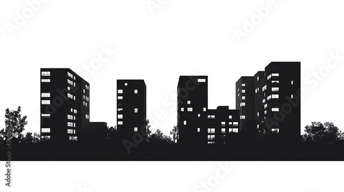 Fototapeta premium Silhouetted apartment buildings in varying heights, clean black design on a stark white background, minimalist style.
