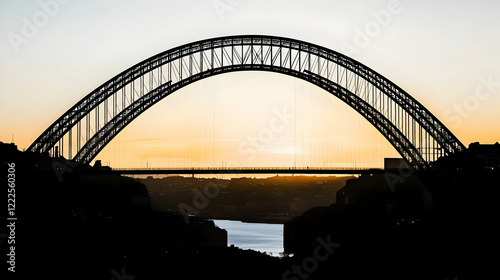 Naklejka premium Silhouetted Arch Bridge Stands Majestically Against a Golden Sunset Over a...