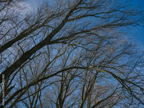 © Victor, Obraz premium Silhouetted bare tree branches forming intricate pattern against clear blue spring sky