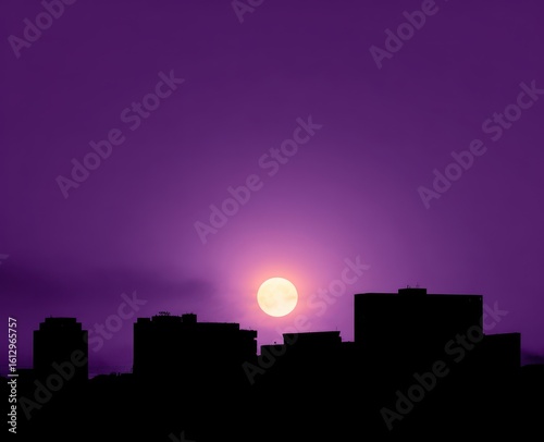 © Almarkha, Fototapeta premium Silhouetted city at dusk, full moon