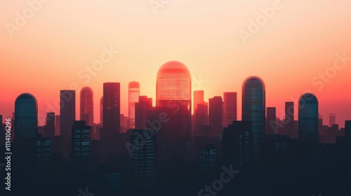 © Kunalai, Fototapeta premium Silhouetted city skyline at sunset with glowing buildings.